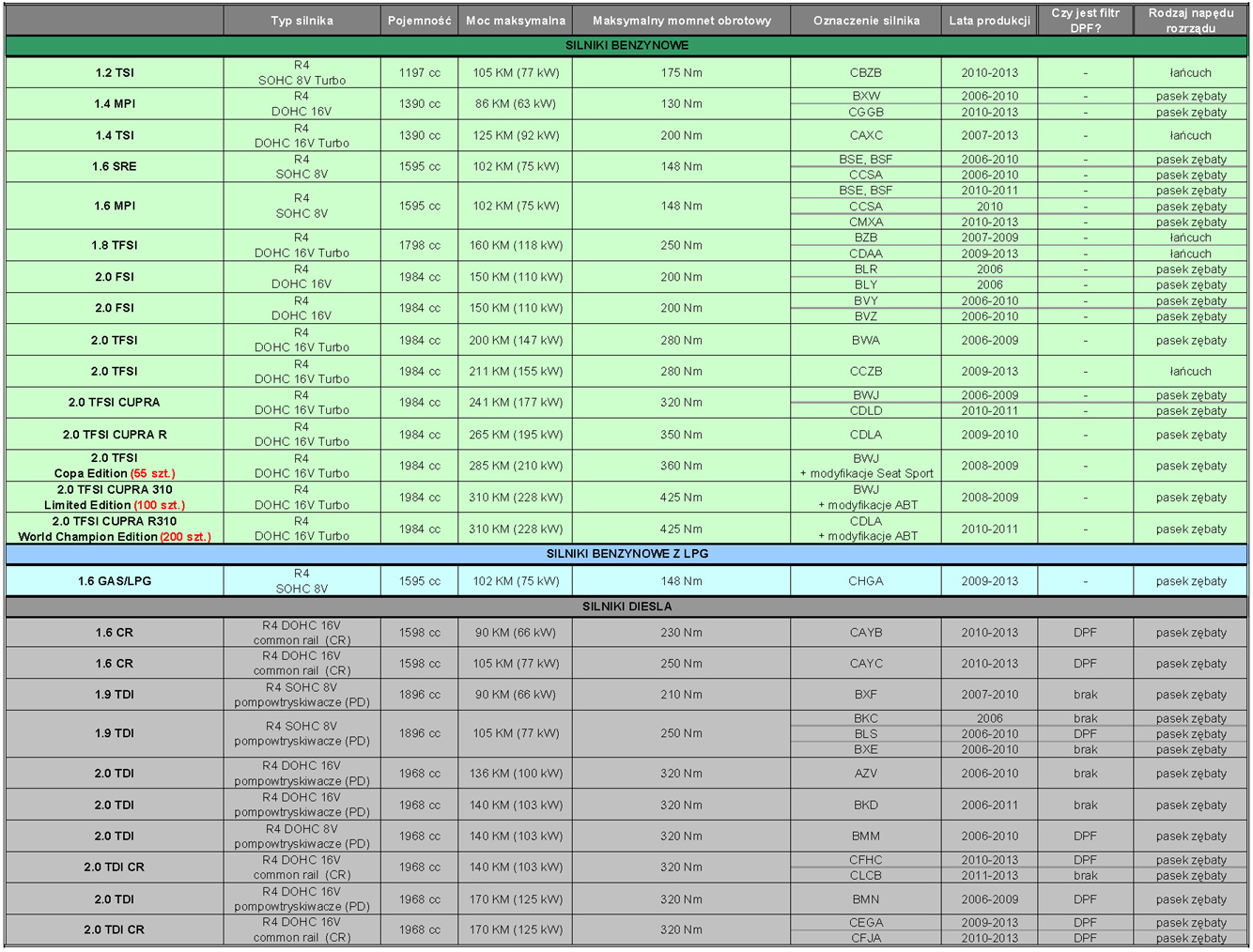 - Silniki stosowane w samochodach marki Seat Leon 1P.