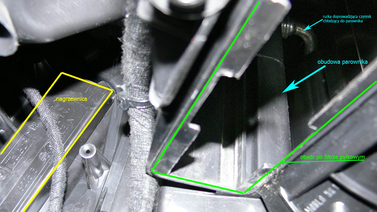 Jedna droga dostępu to wyjęcie filtra pyłkowego (wcześniej trzeba zdemontować osłonę nad stopami pasażera). Otwór powstały po wyjęciu filtra jest chyba jednak trochę mały na takie operacje i pewnie dobrze byłoby wyjąć również wentylator. Przez otwór po wentylatorze można wprowadzić preparat odgrzybiający w okolice parownika jeśli mamy dość długą rurkę.