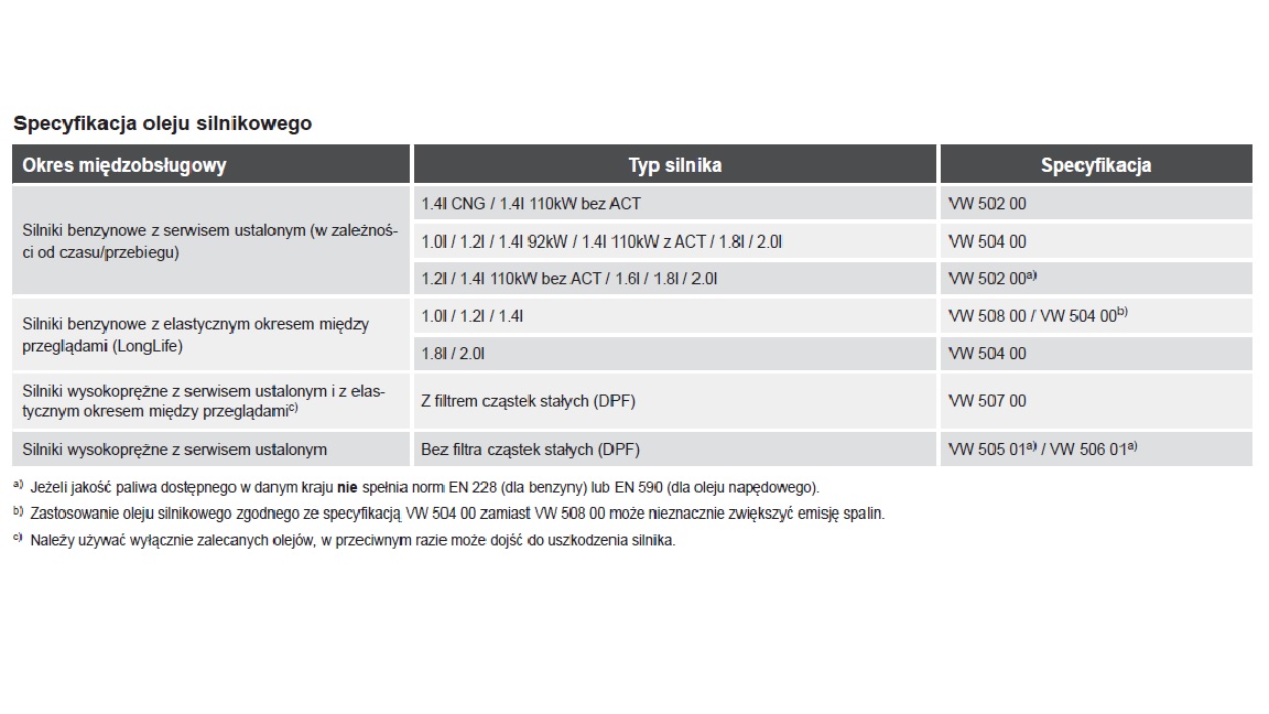 Norma VW 502 przy stałym interwale olejowym jest dopuszczona w większości modeli. Wyjątkiem są np. 1.0 DKLB, 1.0 DKRF, czy 2.0 DKZA gdzie poniżej VW 504 nie można zejść. DKZA jest też ciekawym (chyba jedynym) przypadkiem 2.0 w którym dopuszczono z kolei VW 508.