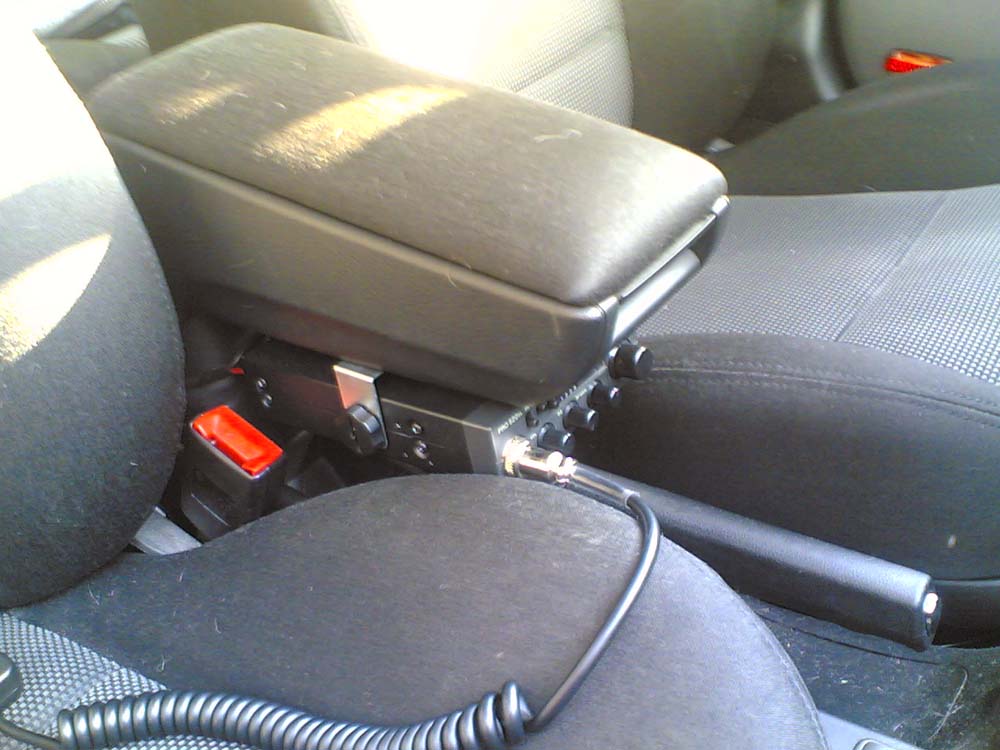 Zdjęcie cb-radia zamontowanego pod podłokietnikiem